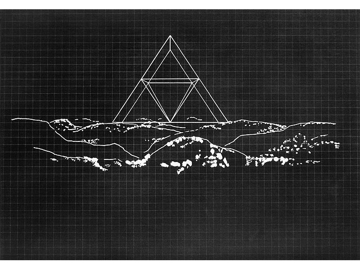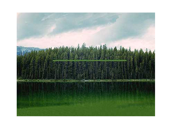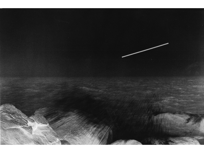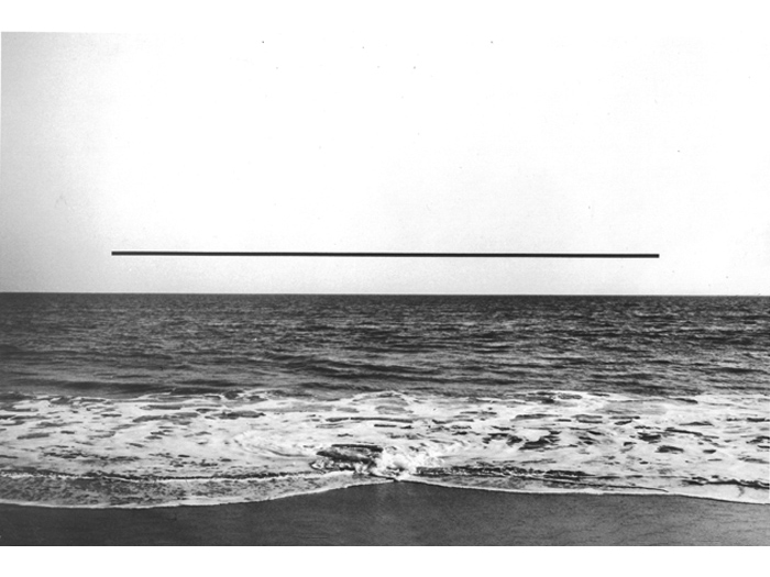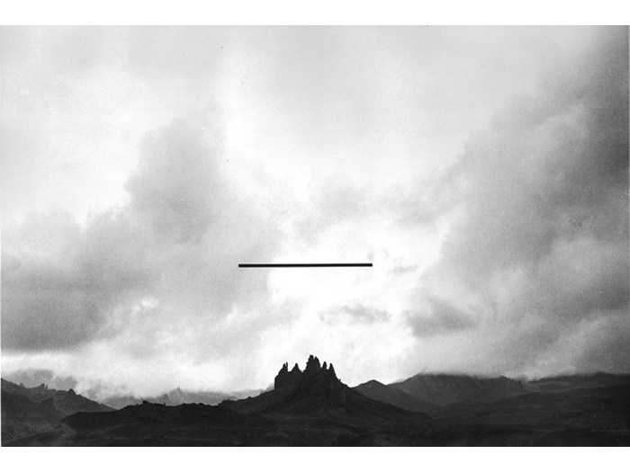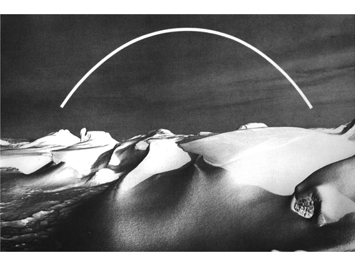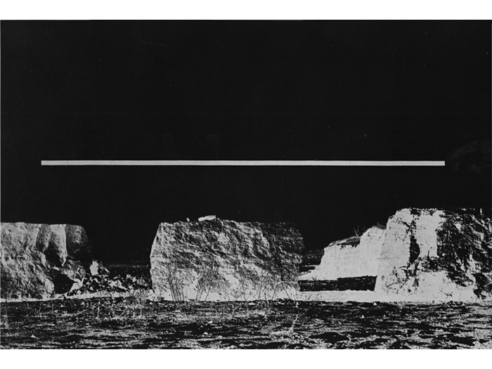 Realizing the superior impact of photography in creating an illusion to natural reality, he soon used photographs to achieve the images he sought. Over photographic images of landscapes, Greenly imposed abstract "energy" of apparently great scale, creating "intangible sculpture". Above these real, but generalized, poetic landscapes are "bars", clearly incorporeal, which set up an almost electrical tension or exchange of energy with the land below. Clearly, these works are part of the same search that led to the discovery of the Primary Transitional Symbol. Nature, space, energy, time, and spirit are united in each work to build an art form that is endlessly evocative and free from the struggles of the ego that created or perceives it."