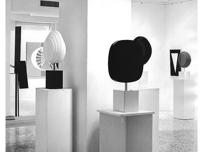 "...To create a compact sculptural unit, he organized a progression of superimposed forms in parallel planes, keeping each form separated from the next by narrow open space, Thus, the work assumed a life of its own through subtle and gradual changes of light reflected in between and on each form. This effect emphasized the transitional quality of the shape. This use of light appeared in his work as early as 1961 in a series of relief paintings and was continued in the polystyrene pieces of the next period of his work. Initially the works were either entirely white, although, the artist points out, not white alone, as the reflected light breaks down into various colors - or wholly black.